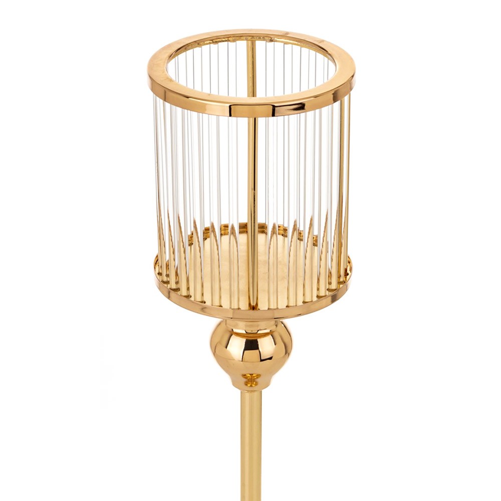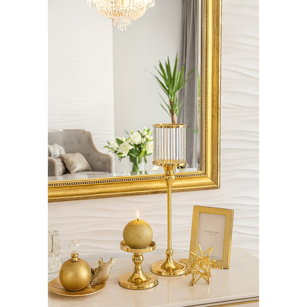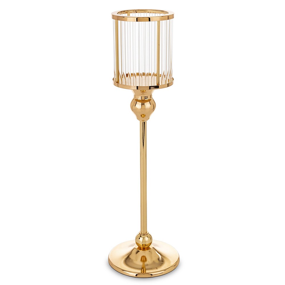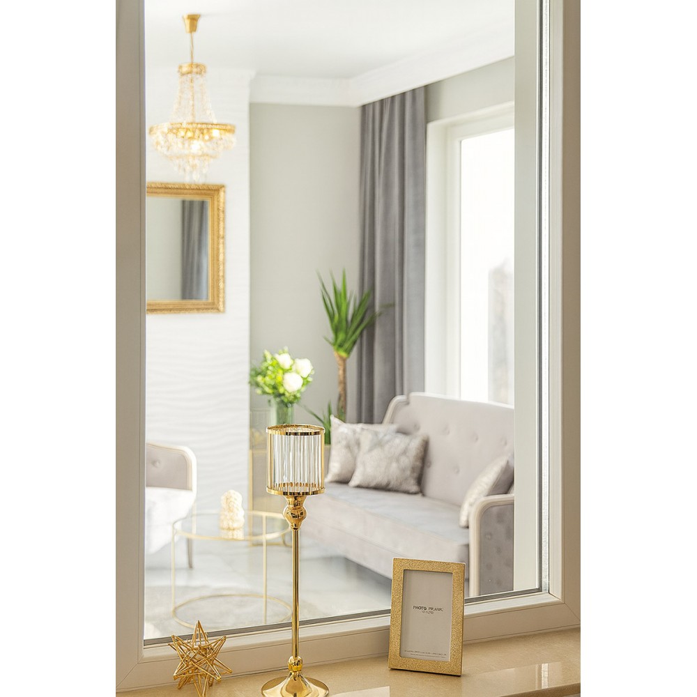 Elegancki świecznik glamour o wymiarach 36 × 10 cm to wyjątkowa dekoracja, która doda blasku każdemu wnętrzu. Wykonany z metalu w złotym kolorze z połyskiem, zachwyca nowoczesną formą i subtelnym połyskiem, który pięknie odbija światło. Klosz w formie pionowych pręcików nadaje całości lekkości i elegancji, tworząc efekt luksusowej oprawy dla świecy.