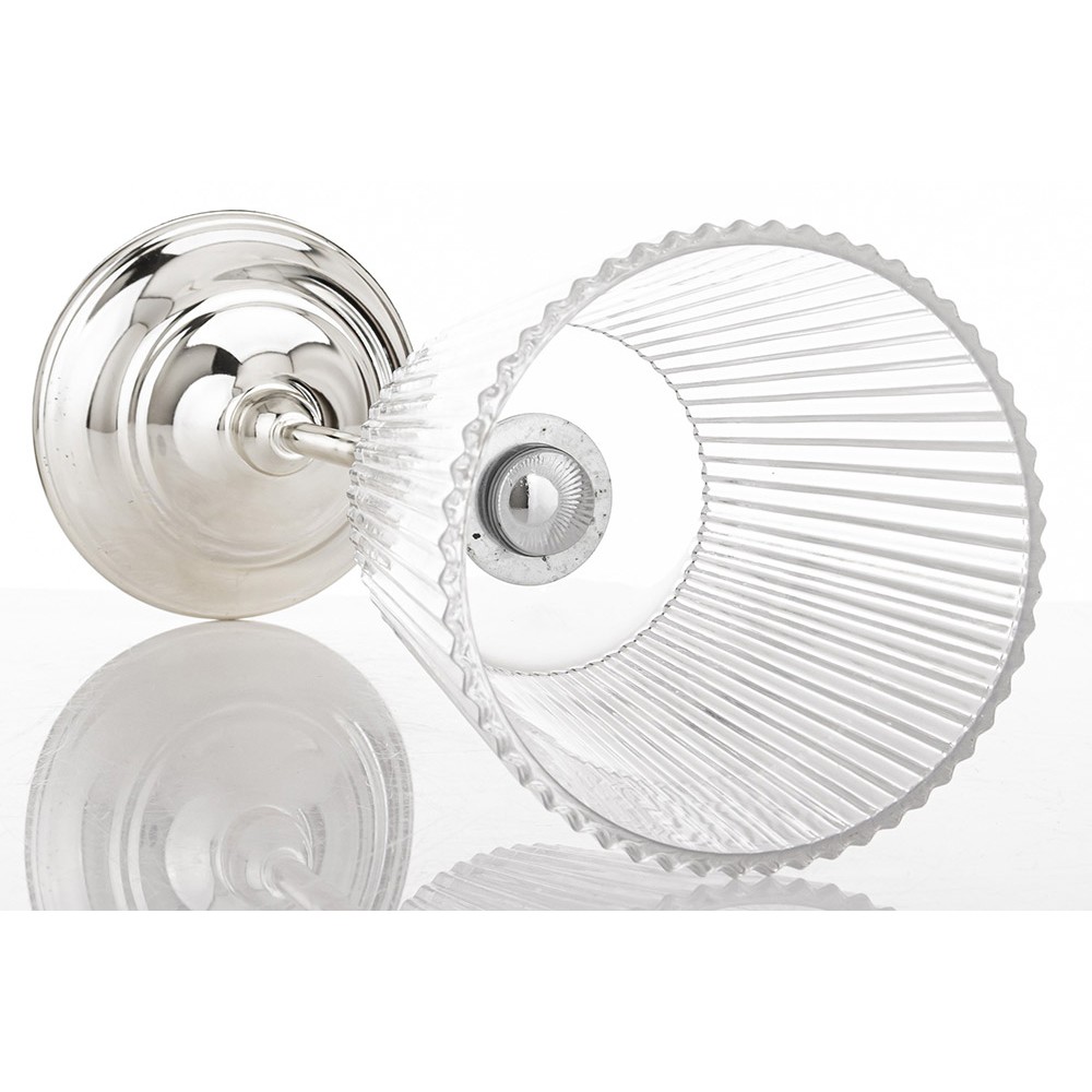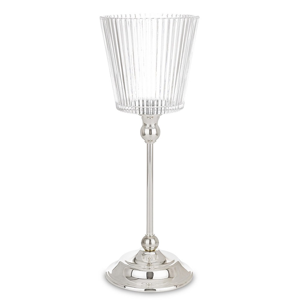 Elegancki świecznik glamour o wymiarach 35 × 13 cm to wyjątkowy dodatek, który doda klasy i blasku każdemu wnętrzu. Wykonany z metalu w srebrnym kolorze oraz szklanego klosza o pionowym ryflowaniu, stanowi połączenie nowoczesnego designu i ponadczasowej elegancji.