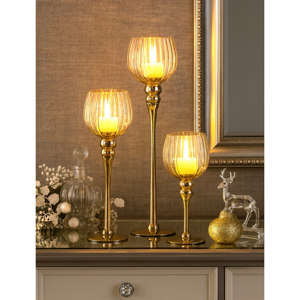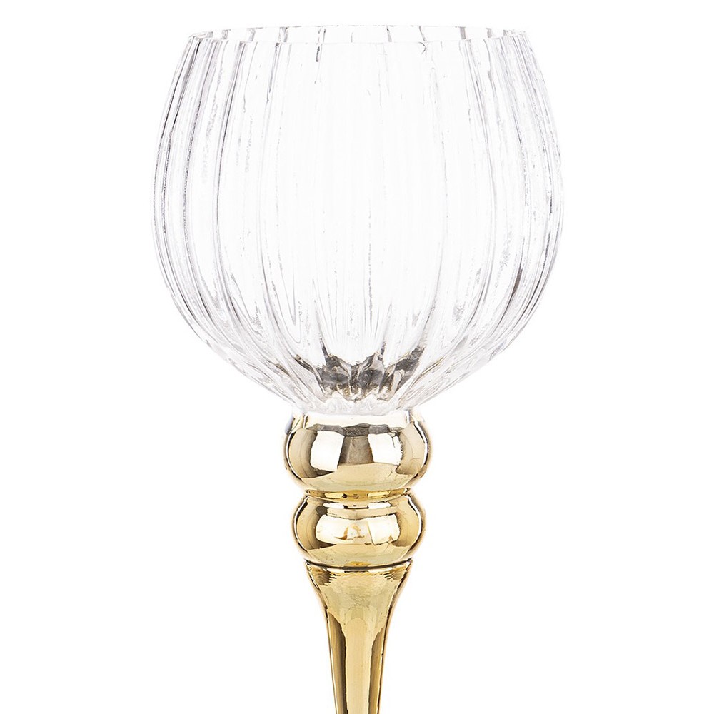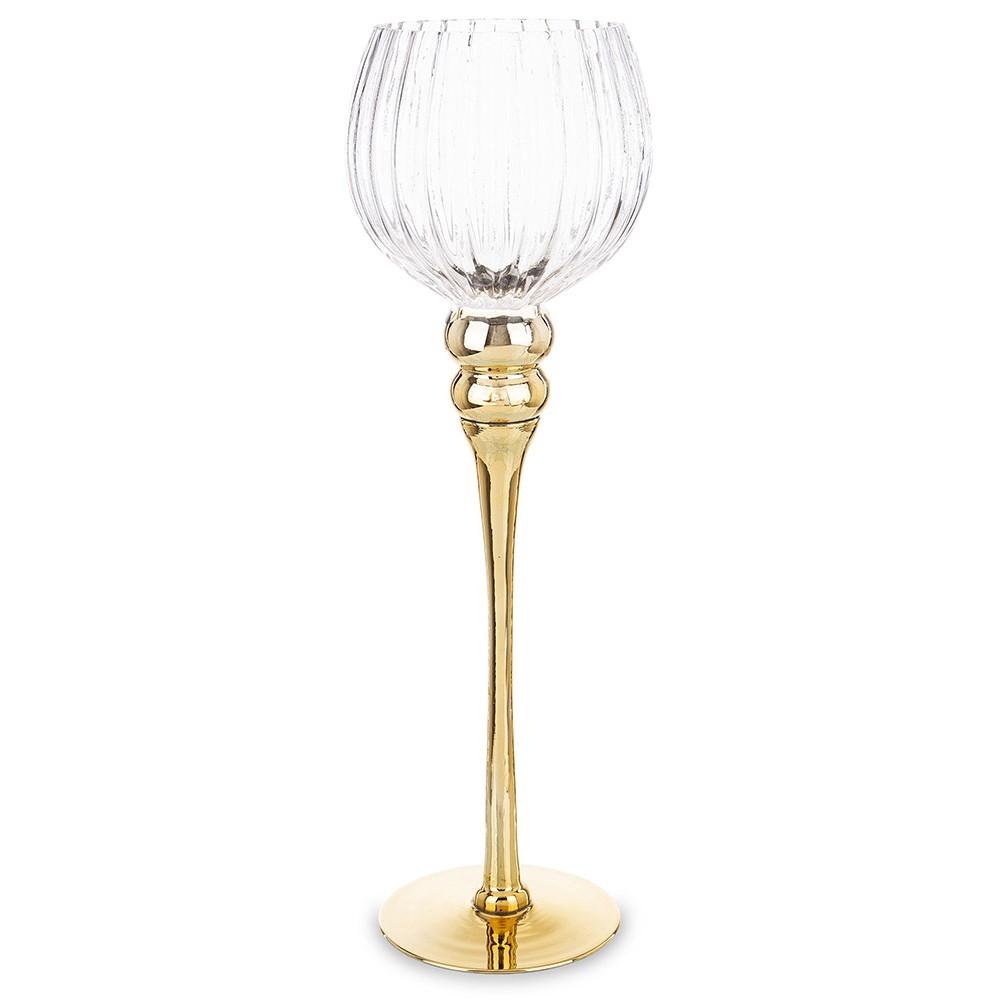 Wnieś do swojego wnętrza odrobinę luksusu i subtelnego blasku dzięki temu wyjątkowemu świecznikowi w stylu glamour. Jego smukła, elegancka forma oraz połączenie transparentnego szkła z połyskującym, złotym wykończeniem sprawiają, że jest on nie tylko praktycznym elementem aranżacji, ale również efektowną dekoracją samą w sobie.