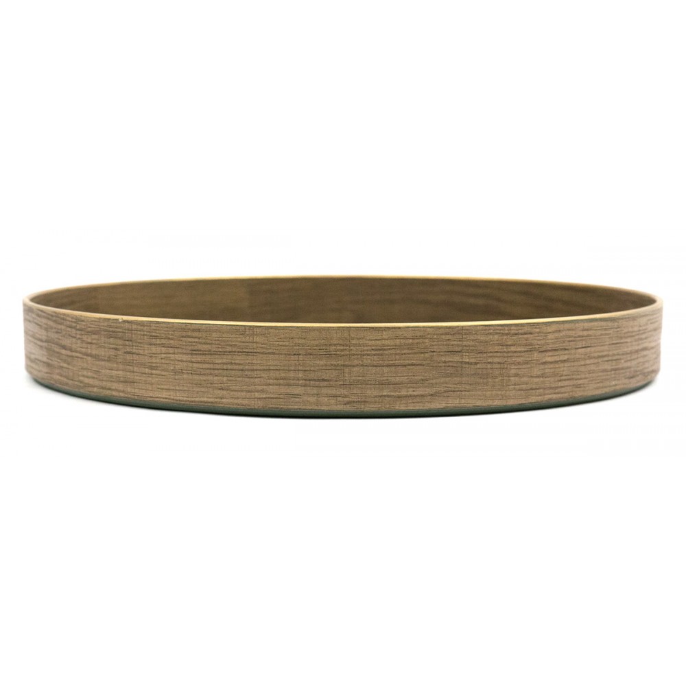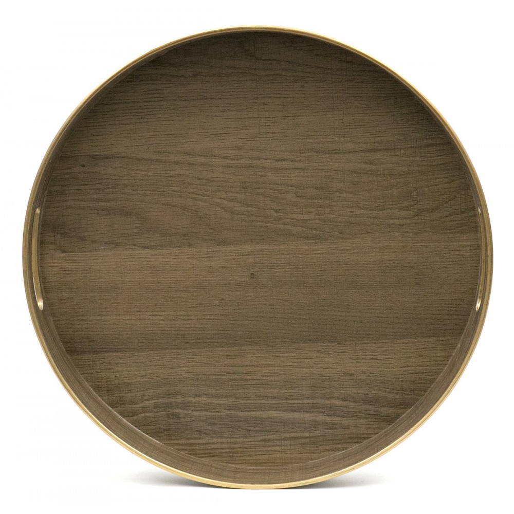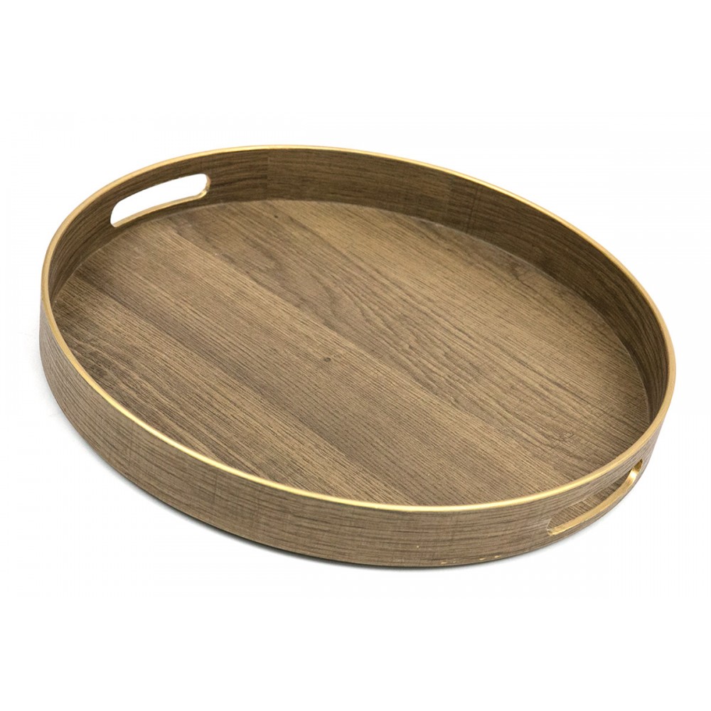 Funkcjonalna taca wykonana z tworzywa sztucznego, pokryta okleiną o wyglądzie drewna. Powierzchnia ma bardziej surowy, mniej jednolity charakter, dzięki czemu dobrze wpisuje się w luźniejsze, codzienne aranżacje wnętrz. Złote wykończenie rantów nadaje jej eleganckiego charakteru i sprawia, że prezentuje się efektownie.