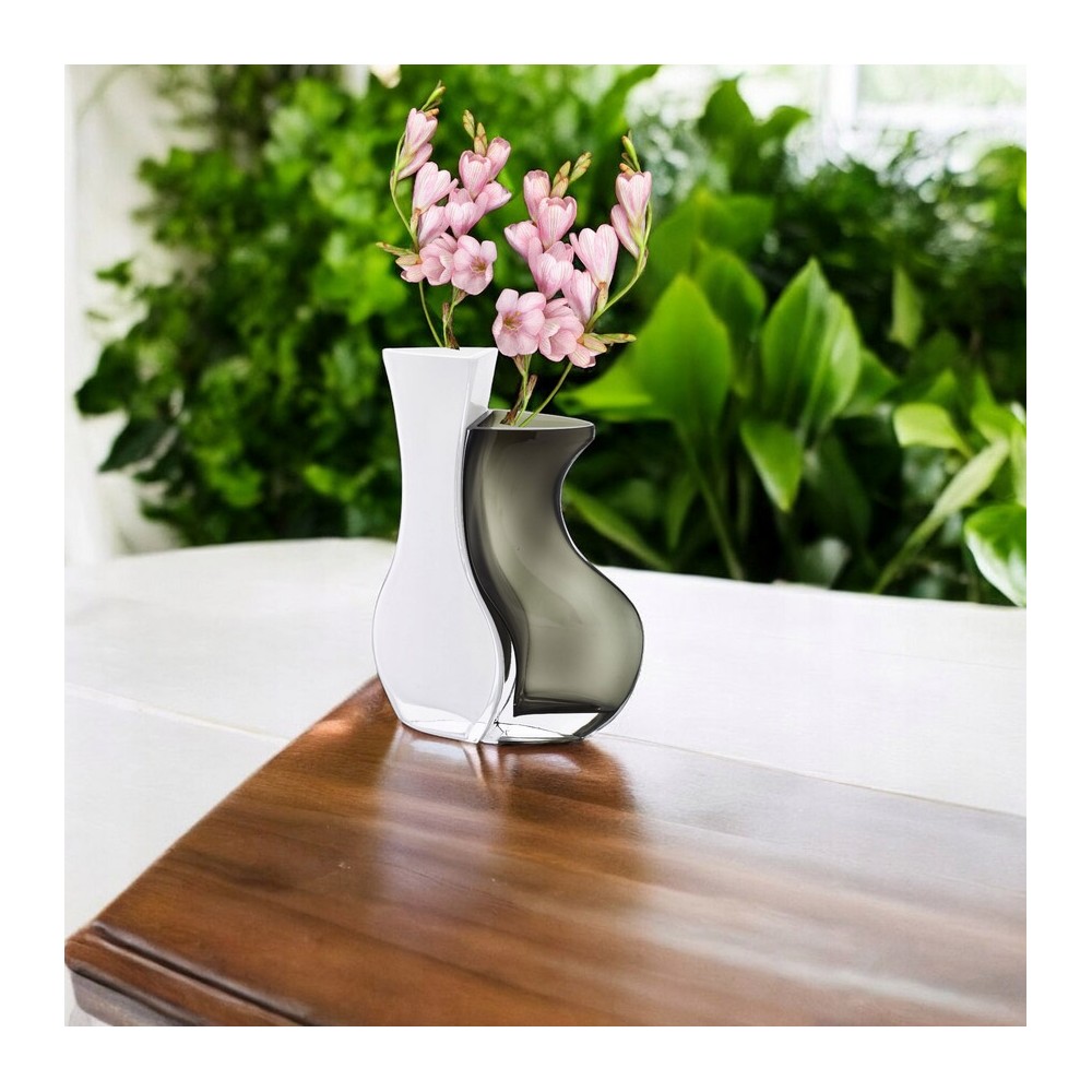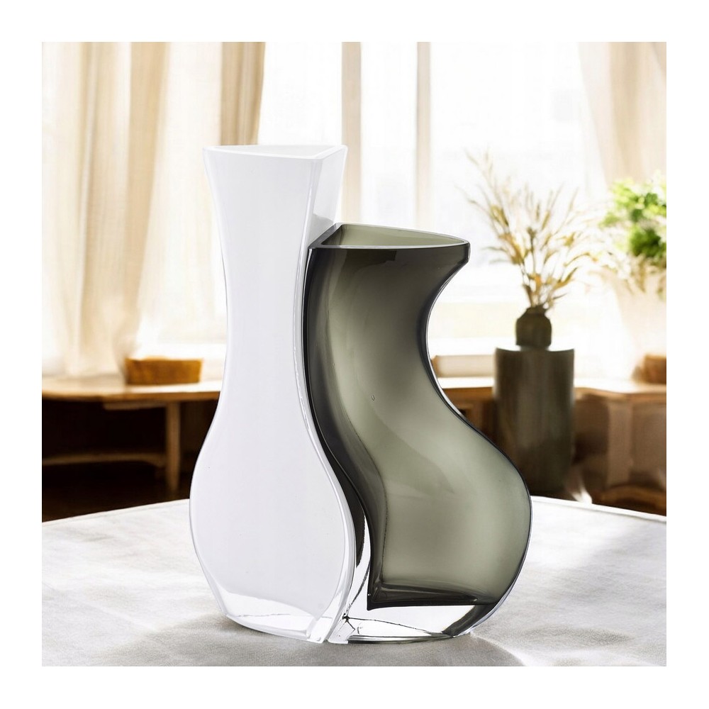 Niespotykany wazon 2 komorowy w stylu glamour koloru białego i czarnego/grafitowego wykonany ze szkła. Jego ponadczasowy design sprawi, że będzie pasował do każdego wnętrza, a dzięki swojemu zdobieniu będzie bardzo widocznym dodatkiem. Idealny na ciekawe kompozycje kwiatowe.