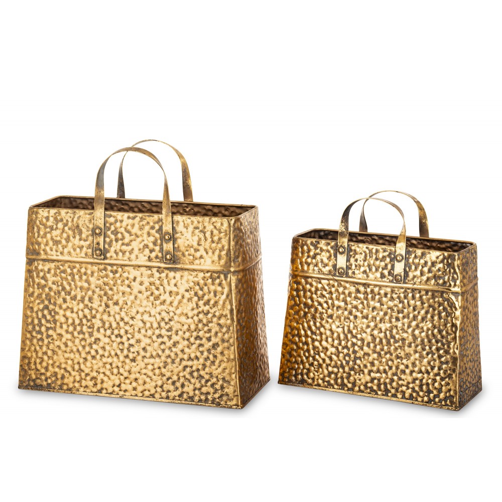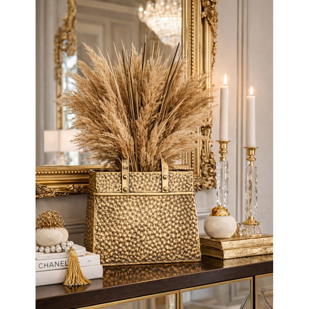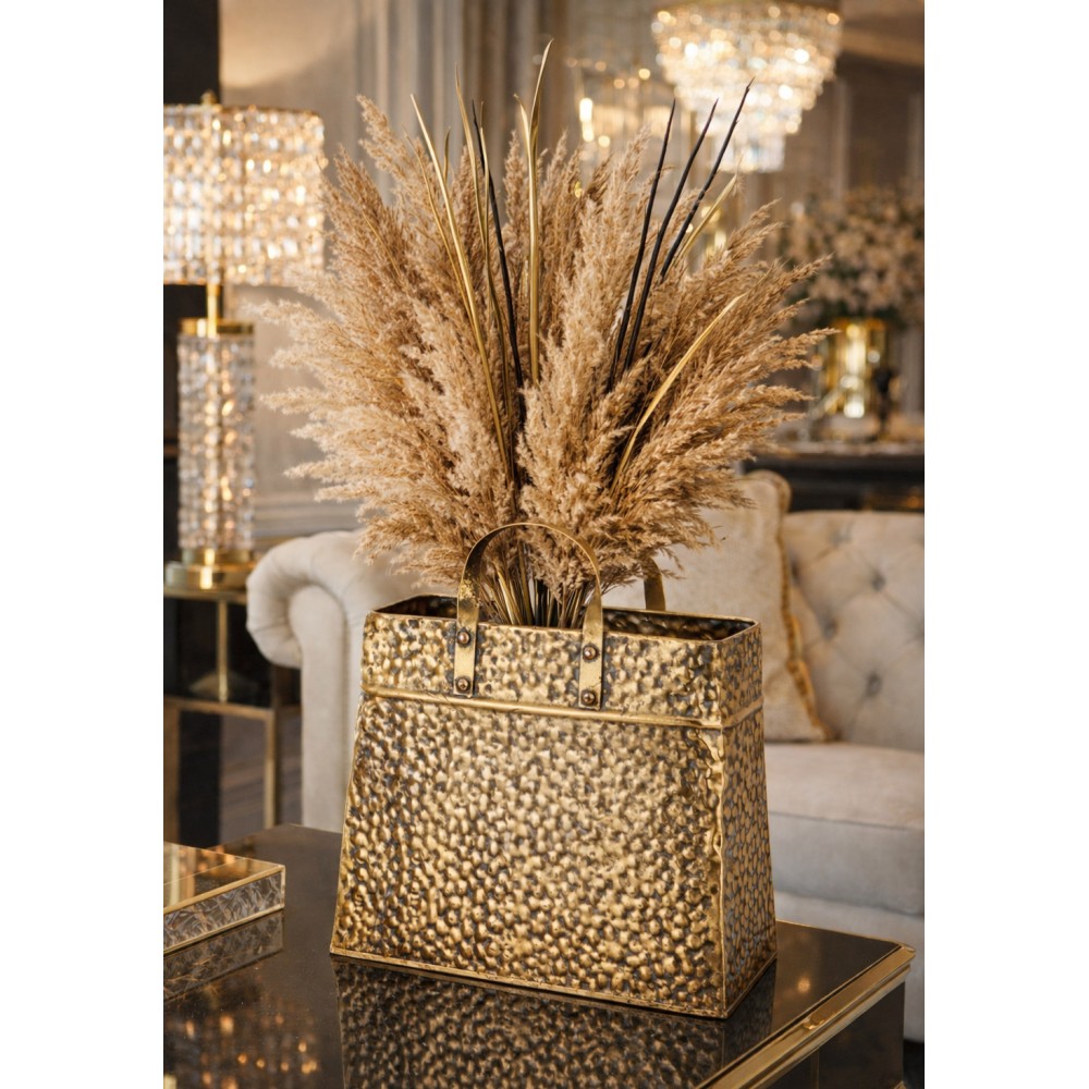 Efektowny wazon dekoracyjny w kształcie torebki to wyjątkowy element wystroju wnętrz, który łączy nowoczesny design z elegancją stylu glamour. Wykonany z metalu o młotkowanej, nieregularnej strukturze, zachwyca luksusowym złotym wykończeniem i oryginalną formą inspirowaną światem mody.