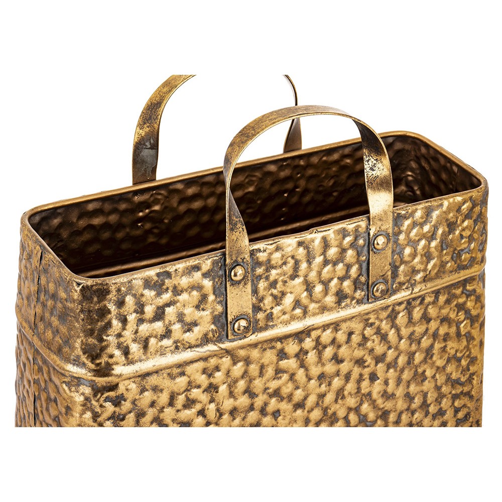 Efektowny wazon dekoracyjny w kształcie torebki to wyjątkowy element wystroju wnętrz, który łączy nowoczesny design z elegancją stylu glamour. Wykonany z metalu o młotkowanej, nieregularnej strukturze, zachwyca luksusowym złotym wykończeniem i oryginalną formą inspirowaną światem mody.