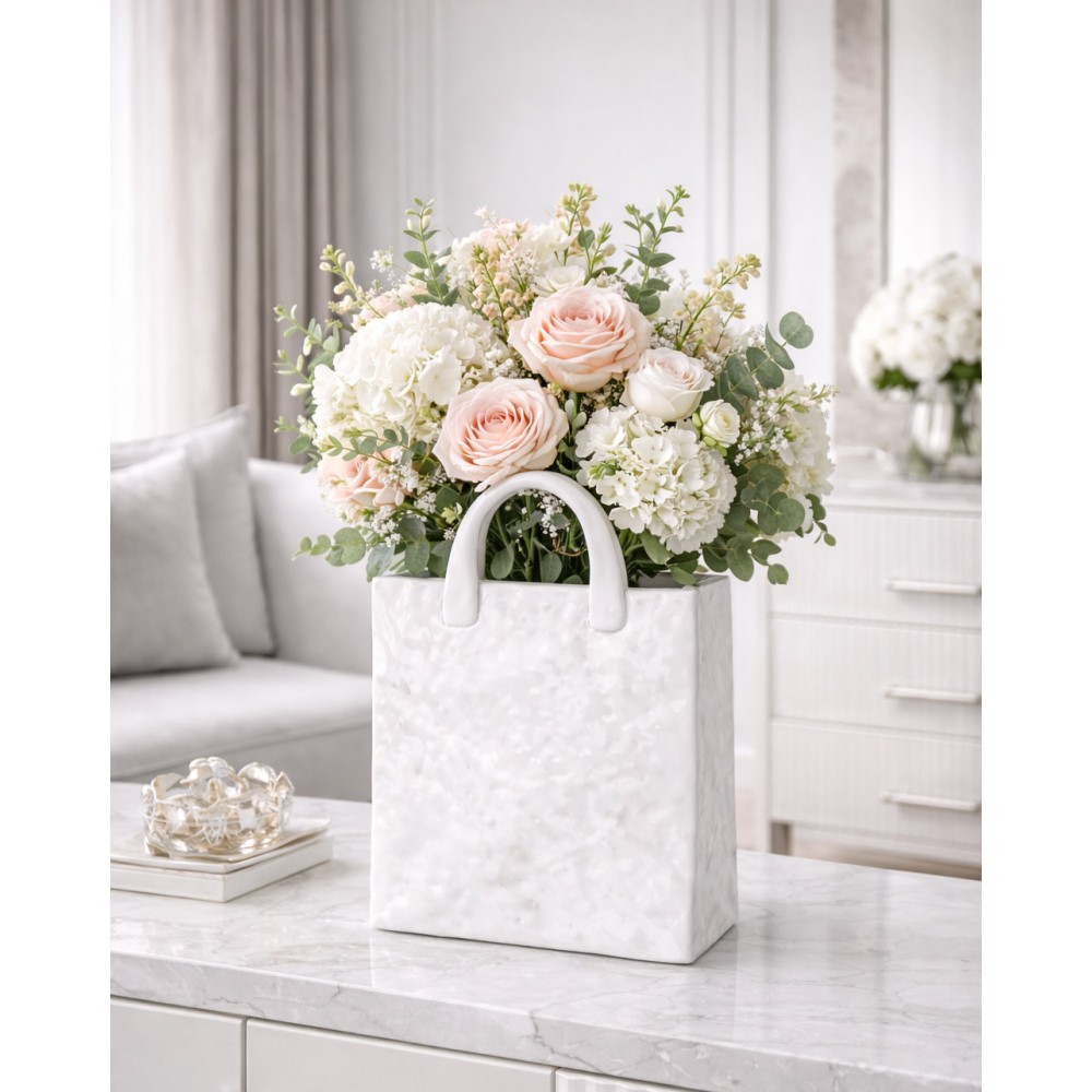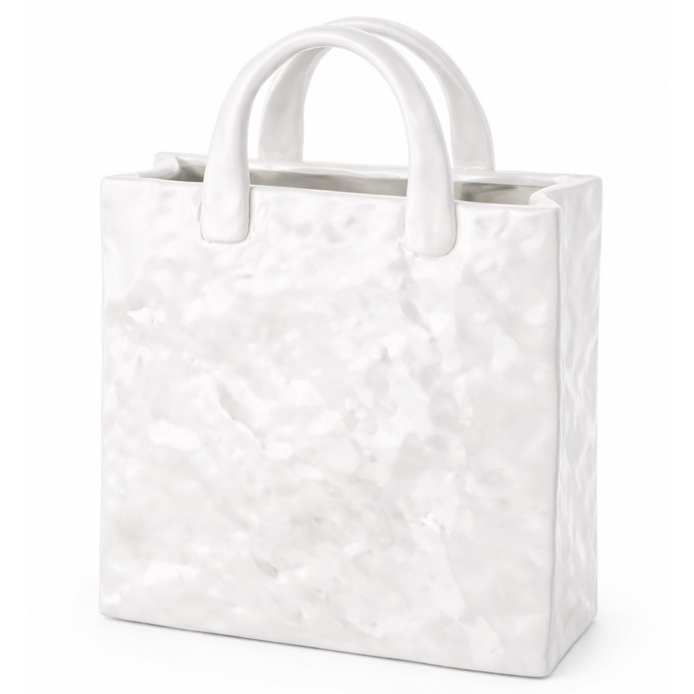 Stylowy wazon dekoracyjny w kształcie torebki to wyjątkowy element wystroju wnętrz, który łączy nowoczesną formę z elegancką prostotą. Wykonany z dolomitu o nieregularnej, delikatnie młotkowanej strukturze, zachwyca subtelnym białym kolorem i minimalistycznym designem.