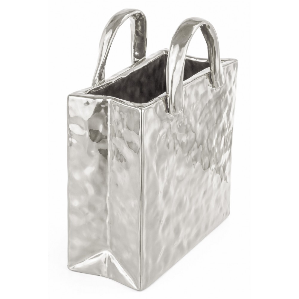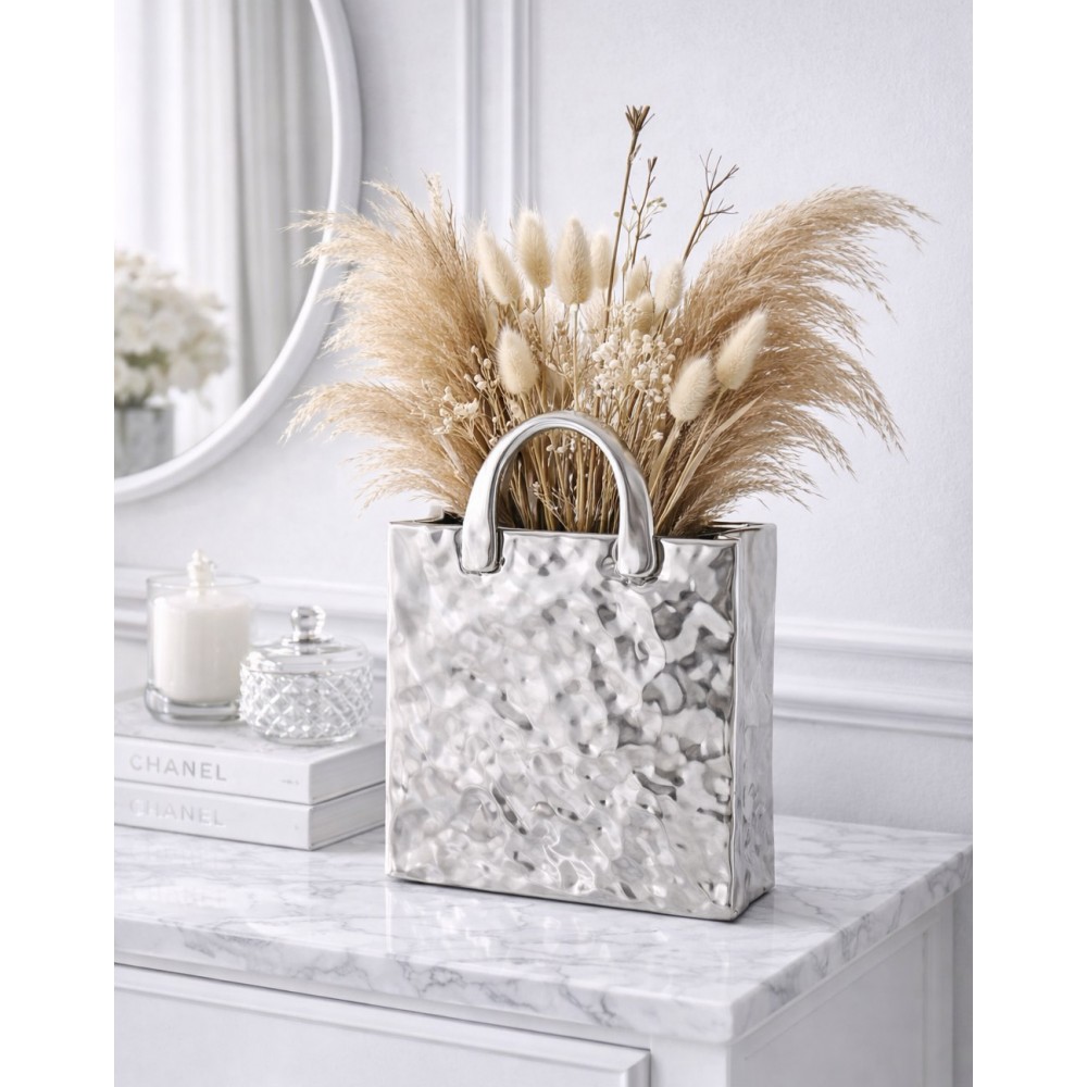 Stylowy wazon dekoracyjny w kształcie torebki to wyjątkowy element wystroju wnętrz, który łączy nowoczesną formę z elegancką prostotą. Wykonany z dolomitu o nieregularnej, delikatnie młotkowanej strukturze, zachwyca srebrnym kolorem i minimalistycznym designem.