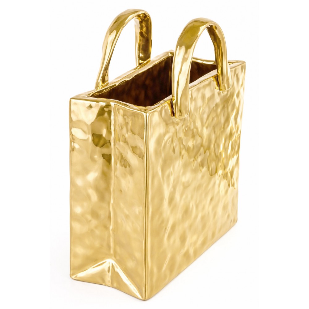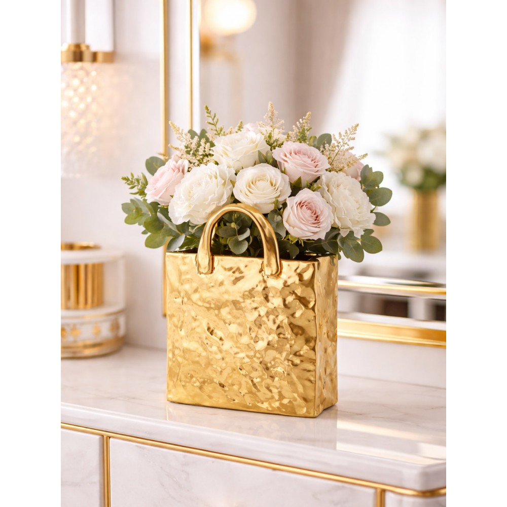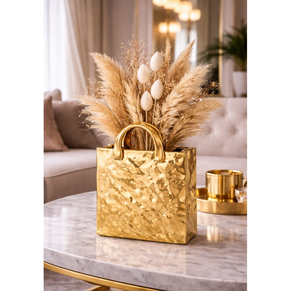 Stylowy wazon dekoracyjny w kształcie torebki to wyjątkowy element wystroju wnętrz, który łączy nowoczesną formę z elegancką prostotą. Wykonany z dolomitu o nieregularnej, delikatnie młotkowanej strukturze, zachwyca złotym kolorem i minimalistycznym designem.