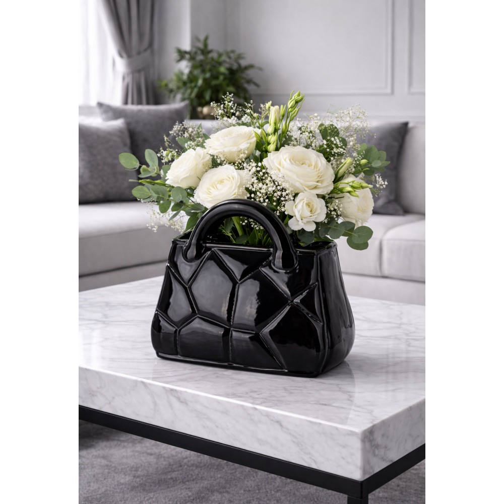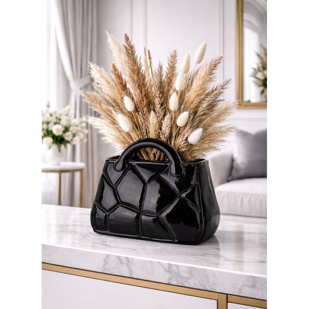 Wyjątkowy wazon dekoracyjny w kształcie torebki to stylowy akcent, który doskonale podkreśli charakter nowoczesnych i eleganckich wnętrz. Wykonany z ceramiki o efektownej, geometrycznej strukturze, przyciąga wzrok głębokim czarnym kolorem oraz błyszczącym wykończeniem, nadając aranżacji luksusowego charakteru.