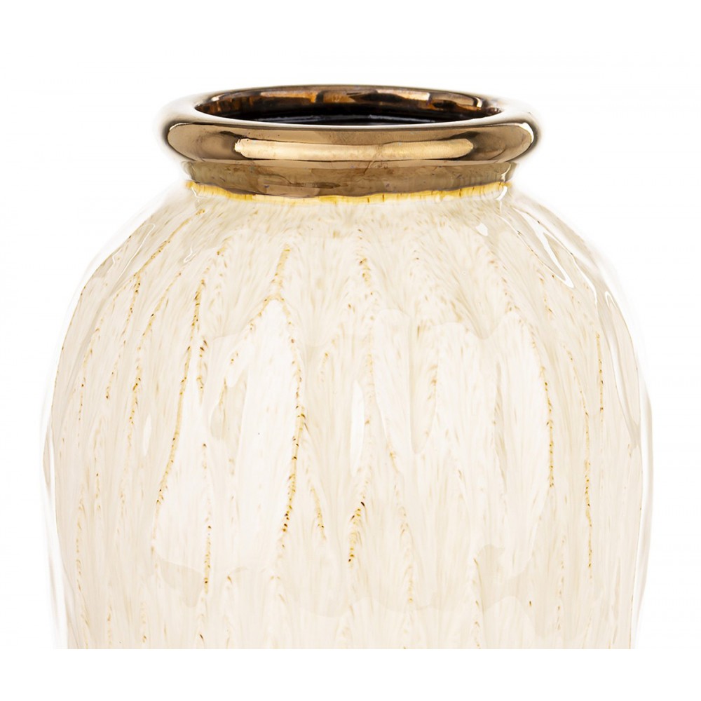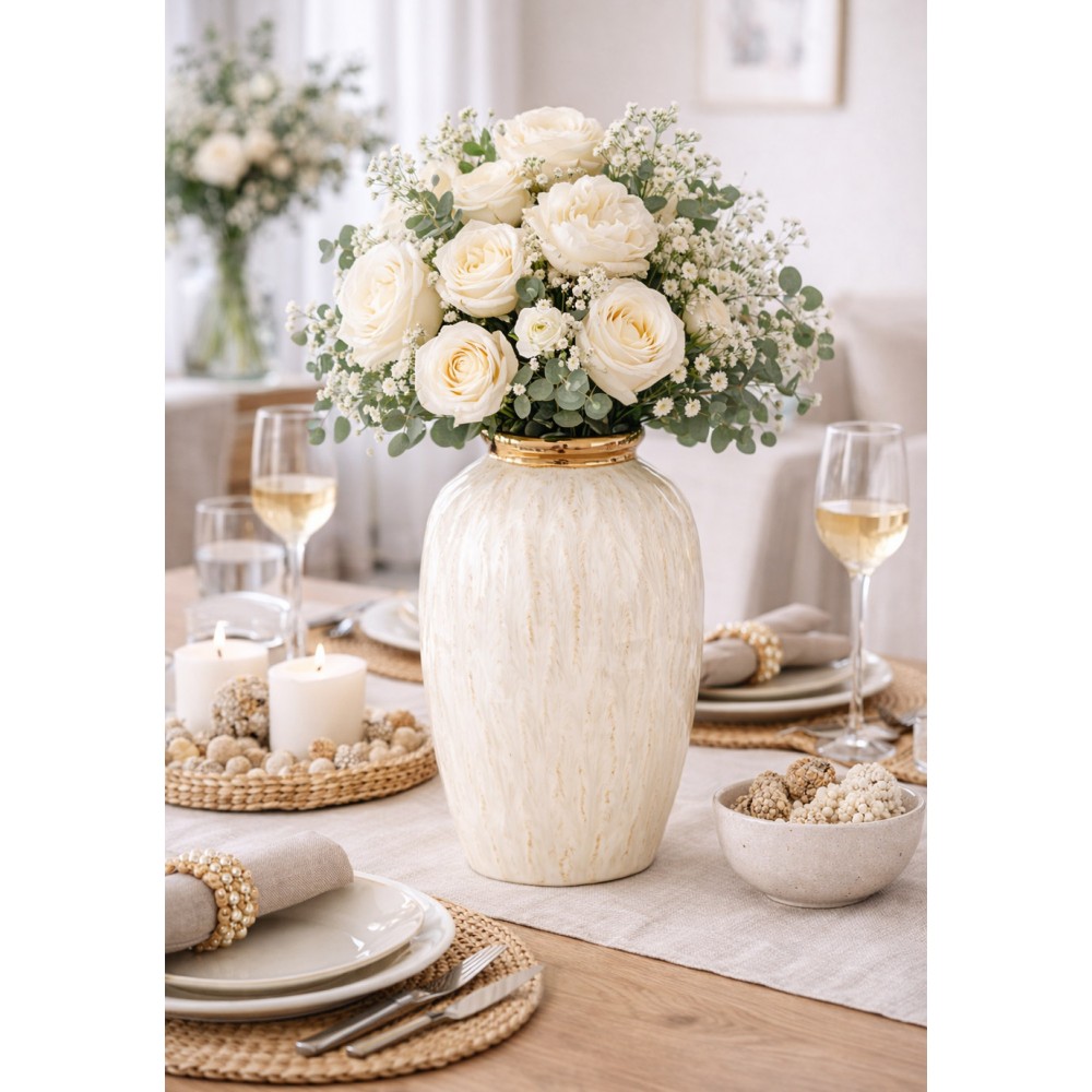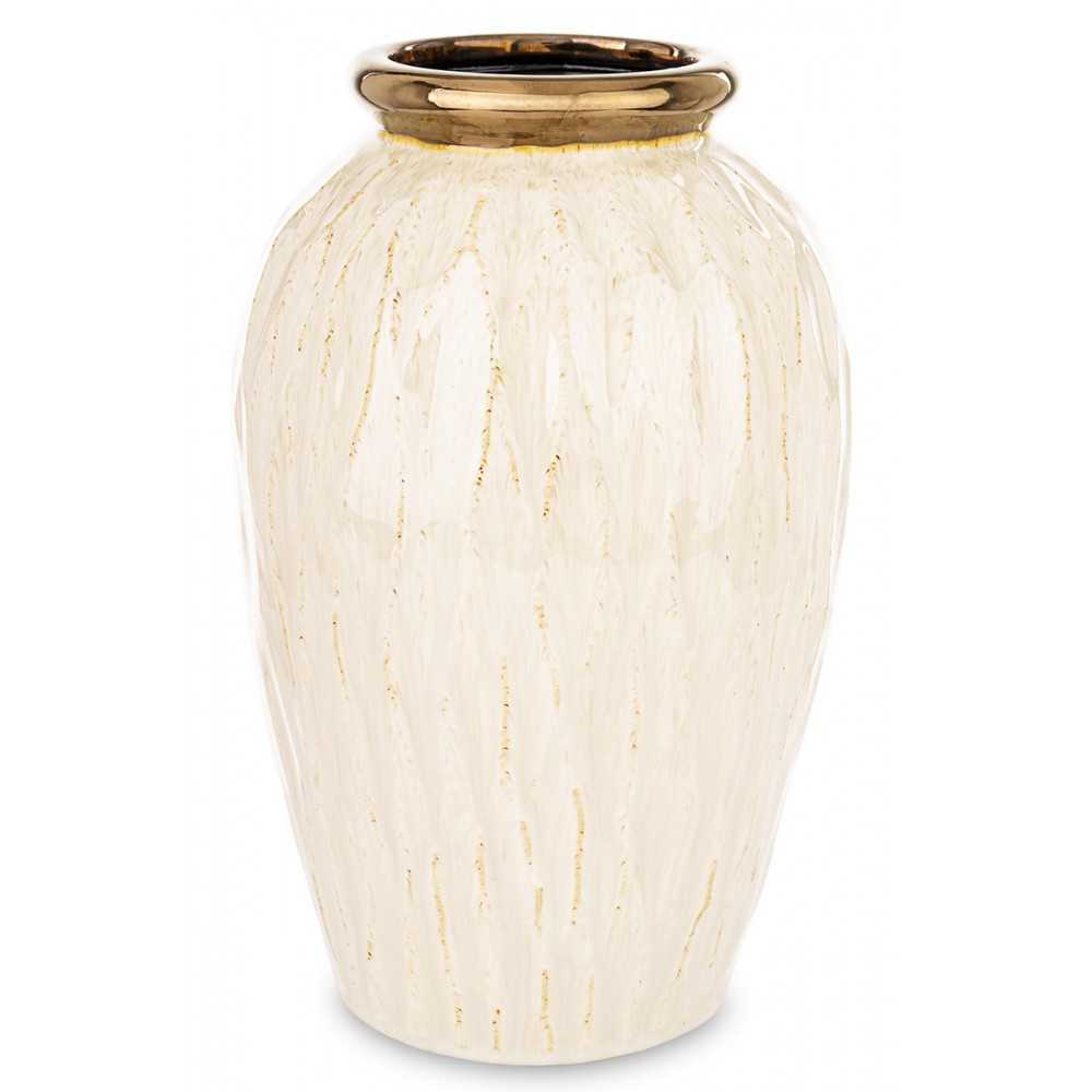 Elegancki wazon ceramiczny o ponadczasowej formie, który doskonale wpisuje się w styl nowoczesny, klasyczny oraz glamour. Jego subtelna, jasna kolorystyka w odcieniach kremu została wzbogacona delikatną strukturą oraz efektownym, złotym rantem o wysokim połysku.