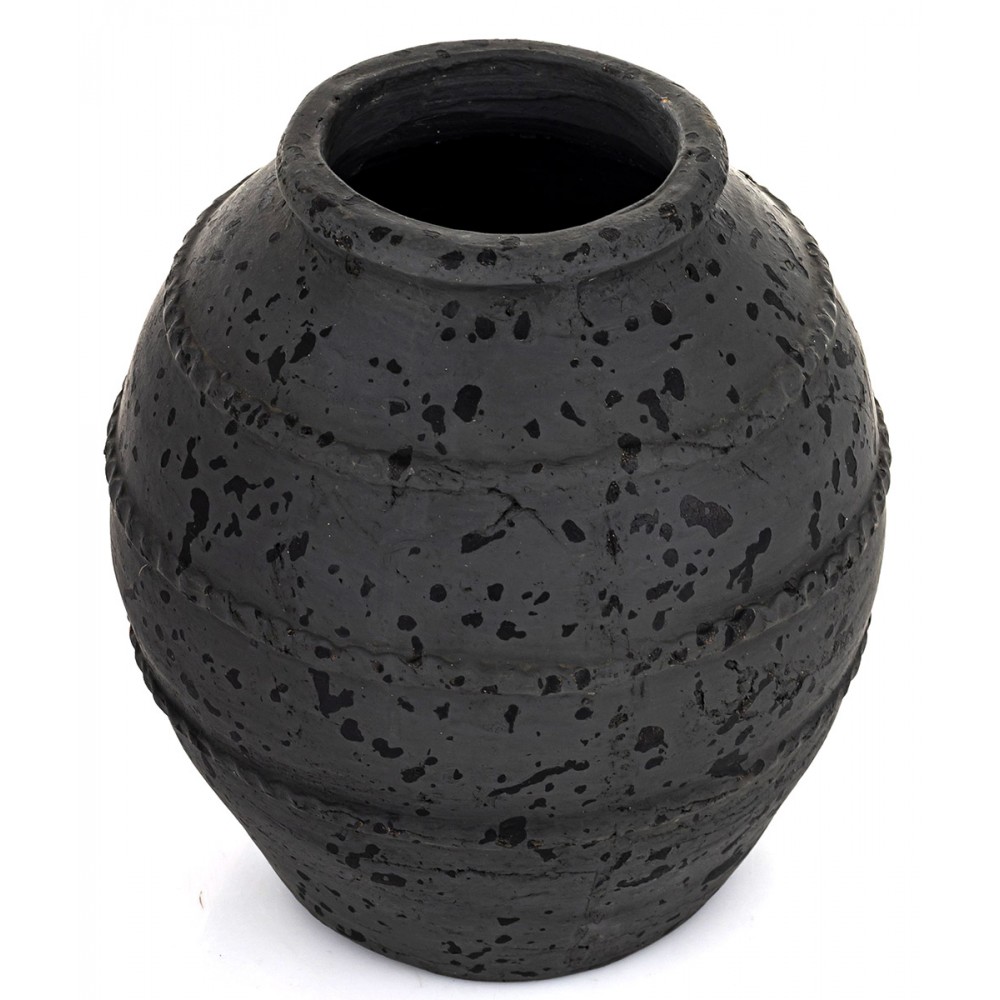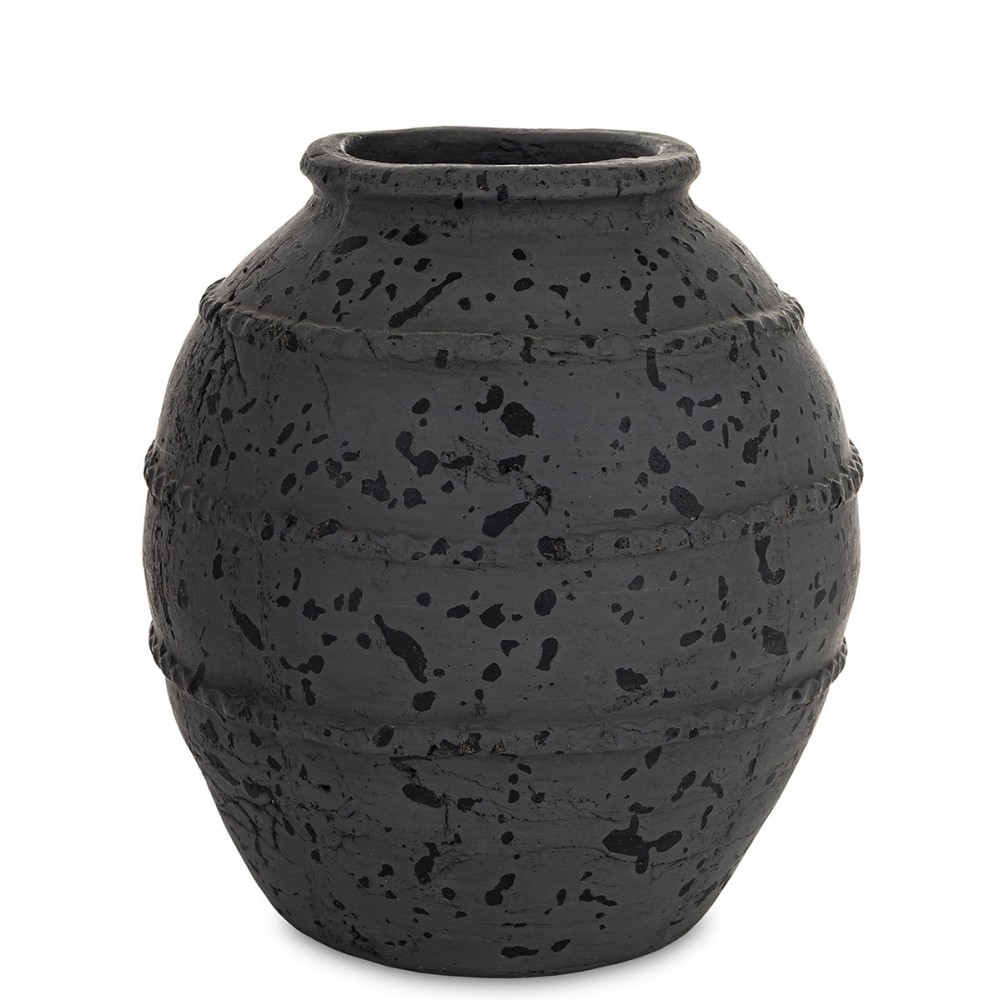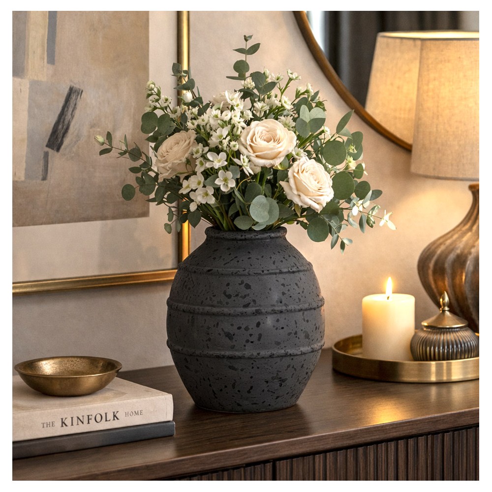 Niespotykany wazon dekoracyjny w grafitowo-czarnym kolorze to wyjątkowy element aranżacji wnętrz w stylu loft, industrialnym oraz nowoczesnym. Jego charakterystyczna, lekko postarzana struktura z nieregularnymi przetarciami nadaje mu unikalny, surowy wygląd inspirowany rzemiosłem.