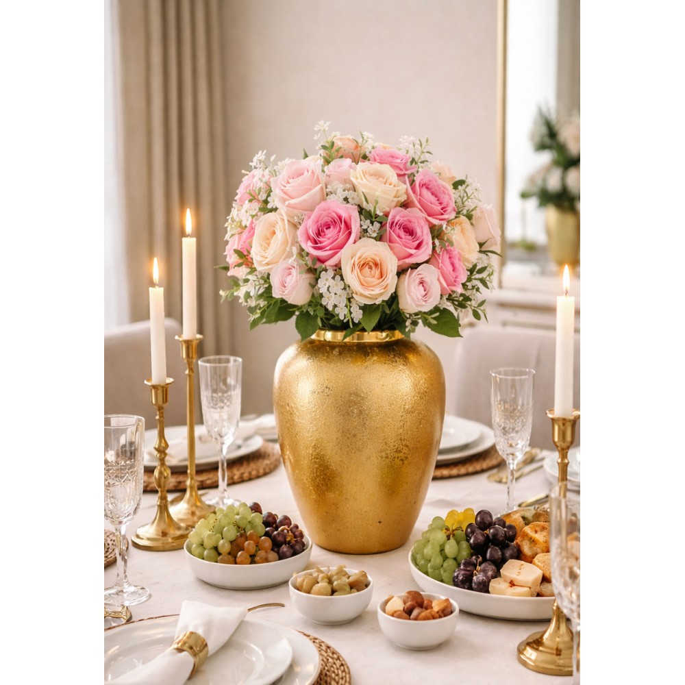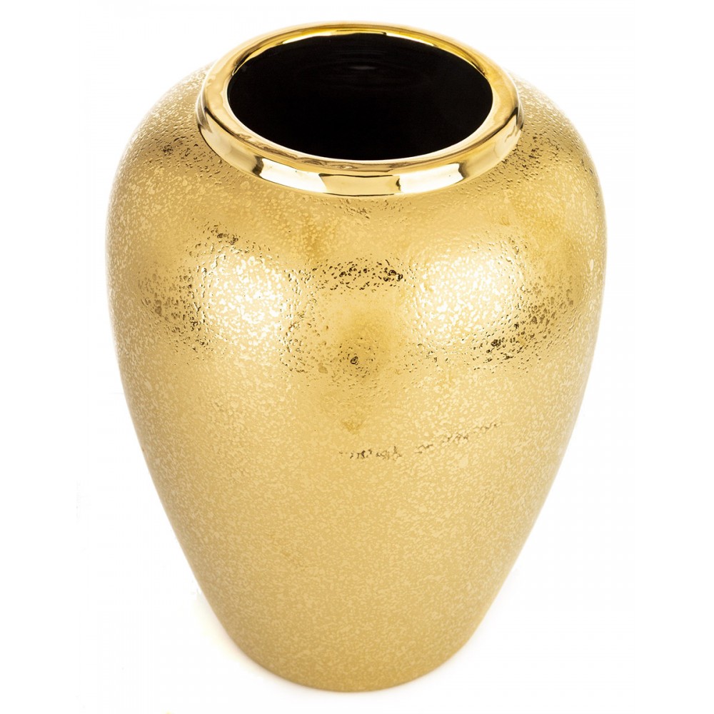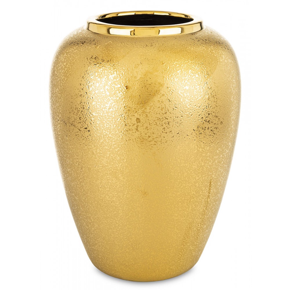 Elegancki wazon dekoracyjny w kolorze złotym to wyjątkowy element wystroju wnętrza, który przyciąga uwagę swoją szlachetną, połyskującą powierzchnią i subtelną, nieregularną strukturą. Jego klasyczna forma została wzbogacona o nowoczesne wykończenie, dzięki czemu doskonale odnajdzie się zarówno w aranżacjach glamour, jak i nowoczesnych czy loftowych.