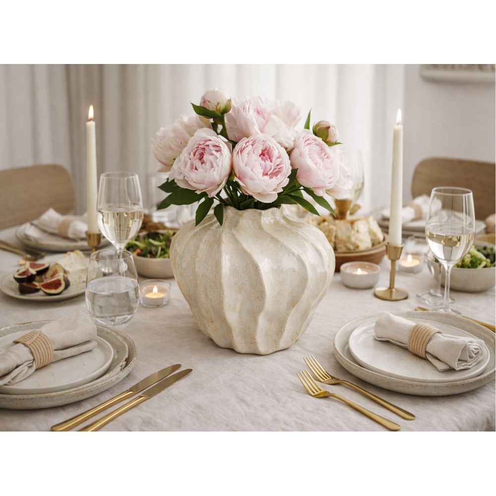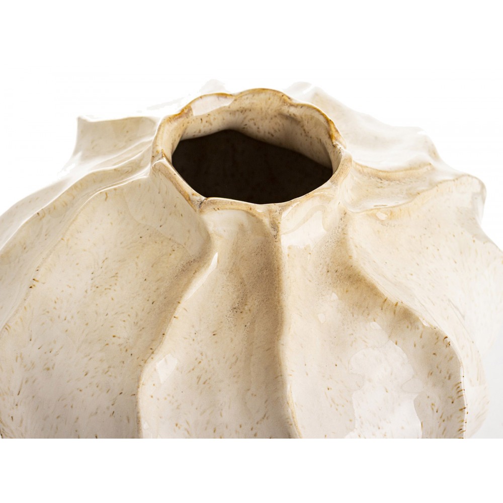 Powierzchnia wazonu została wykończona w delikatnym połysku, z widoczną, lekko nakrapianą strukturą w odcieniach kremu i beżu. Taki efekt sprawia, że każdy egzemplarz jest unikatowy i doskonale wpisuje się w aktualne trendy wnętrzarskie – od stylu boho i naturalnego, po nowoczesny i skandynawski.