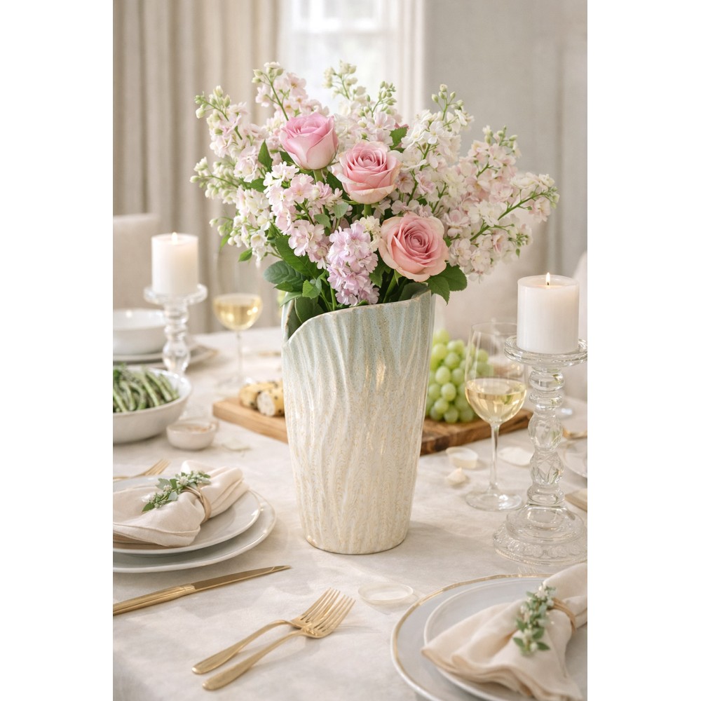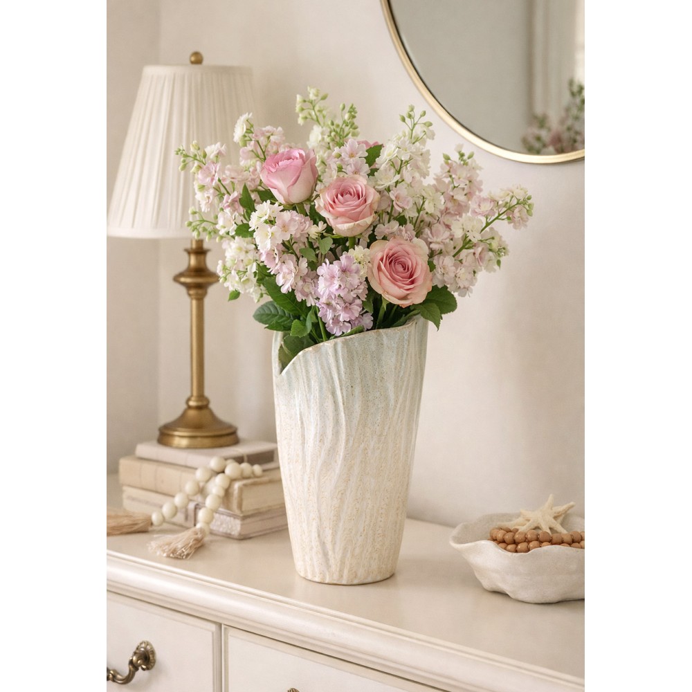Stonowana kolorystyka w odcieniach kremu z subtelnymi, nieregularnymi przetarciami sprawia, że wazon idealnie wpisuje się w styl nowoczesny, skandynawski, loftowy oraz klasyczny. To doskonała baza zarówno dla żywych kwiatów, jak i kompozycji sztucznych czy suszonych.