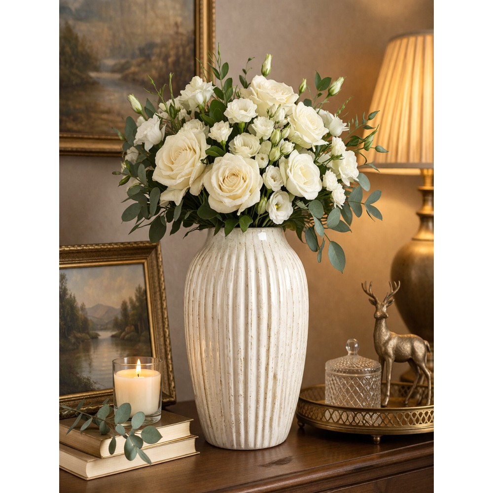 Postaw wazon na komodzie w salonie, dodaj pampasy lub suszone trawy – uzyskasz modny, naturalny klimat. W wersji bardziej eleganckiej świetnie sprawdzi się z żywymi kwiatami na stole lub konsoli.