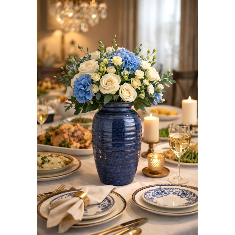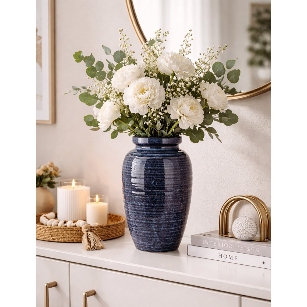Efektowny wazon dekoracyjny w głębokim, granatowym odcieniu, który przyciąga wzrok i nadaje wnętrzu eleganckiego charakteru. Połączenie intensywnej kolorystyki z delikatnie połyskującą, strukturalną powierzchnią tworzy wyjątkowy efekt wizualny.