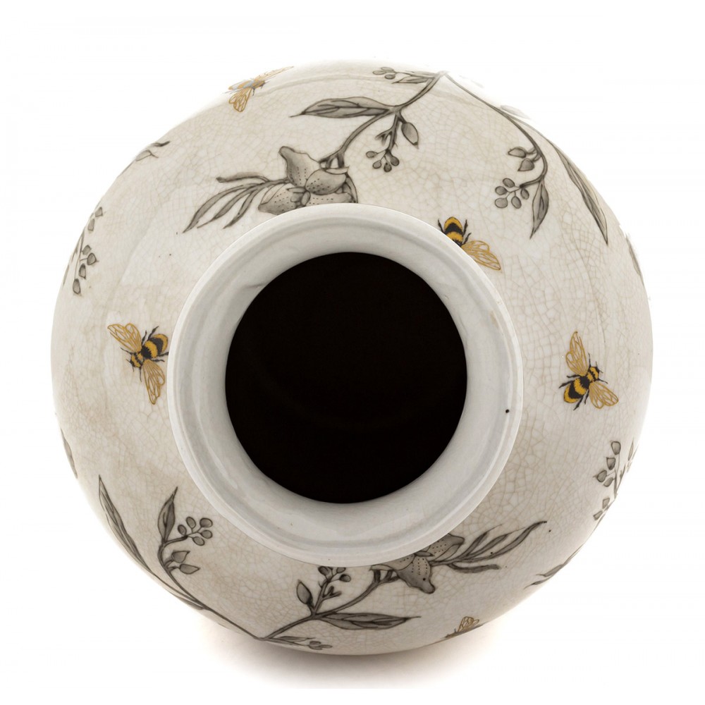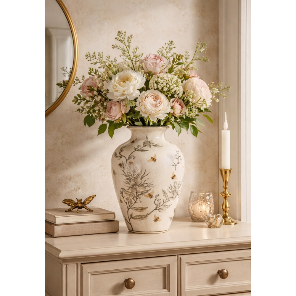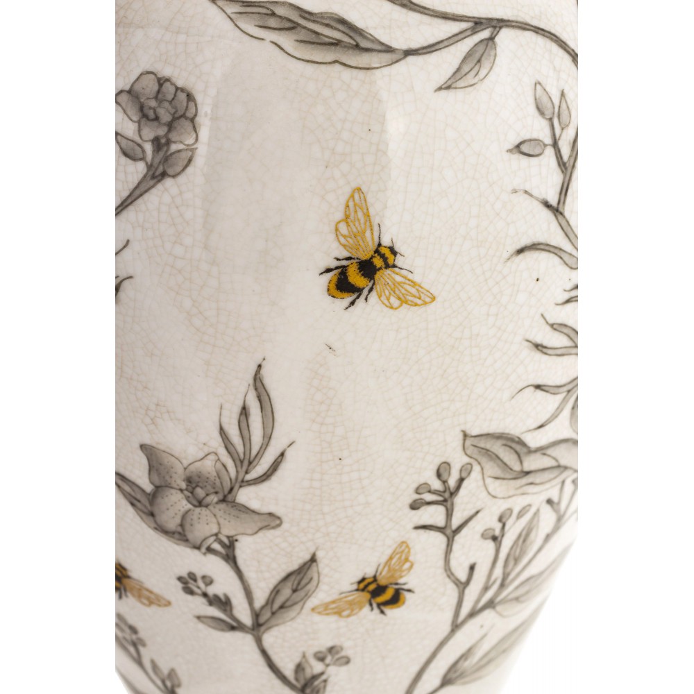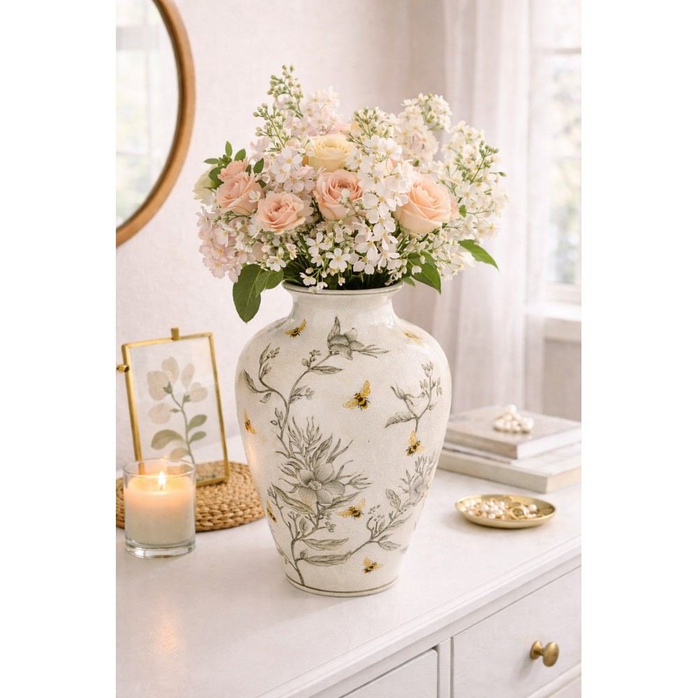 Wyjątkowy wazon wykonany z porcelany, który zachwyca elegancją i subtelnym, dekoracyjnym wzornictwem inspirowanym naturą. Delikatne motywy kwiatowe w połączeniu z ozdobnymi pszczołami tworzą harmonijną kompozycję, nadając wnętrzu ciepły, przytulny charakter.