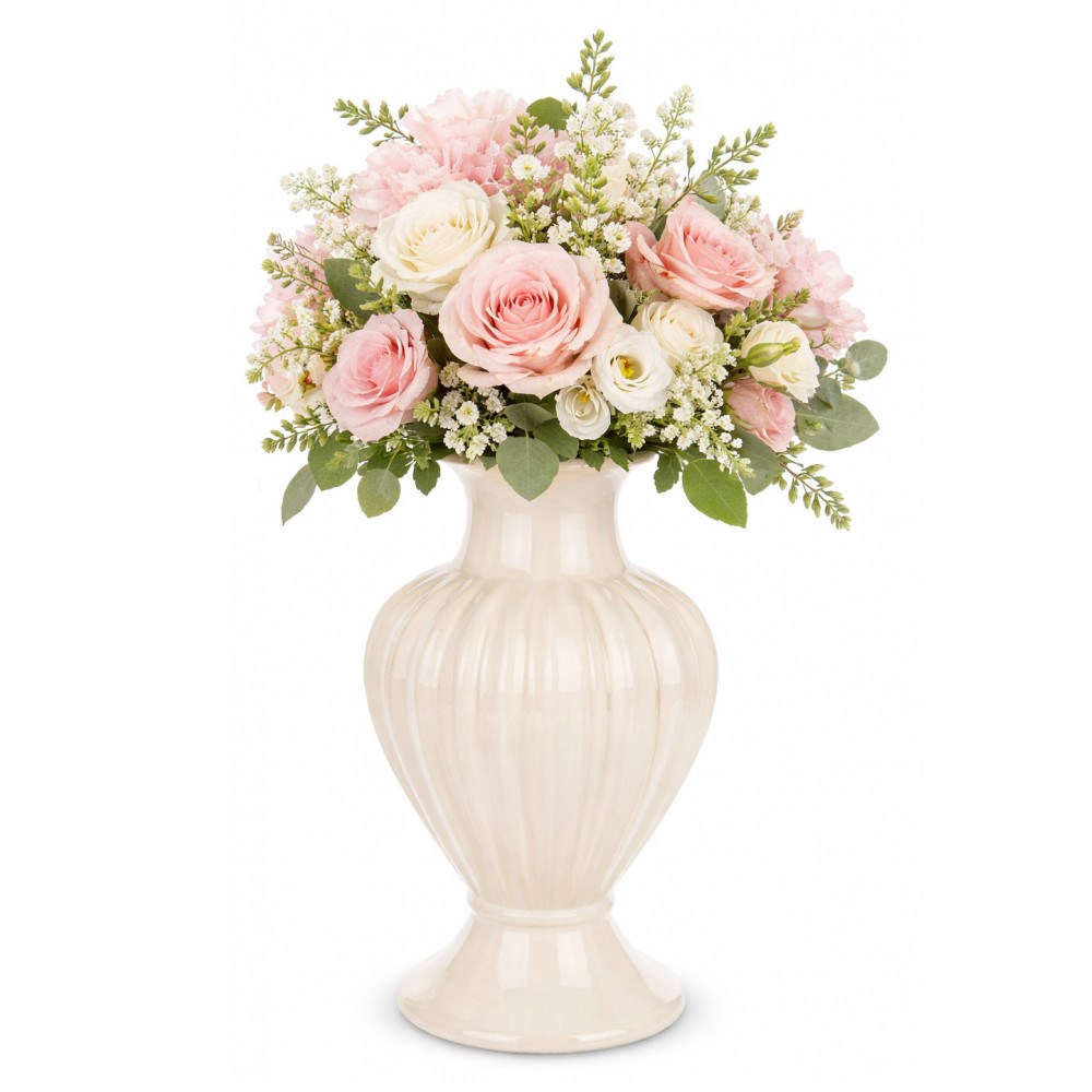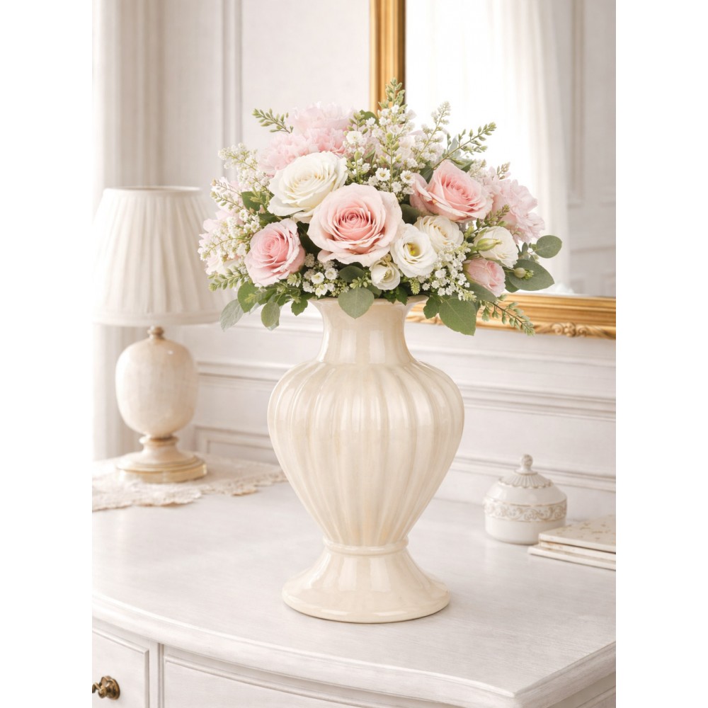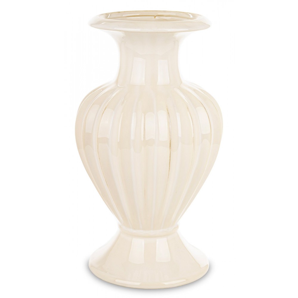 Stylowy wazon ceramiczny w jasnym, kremowym odcieniu (wpadającym w ecru), który doskonale wpisuje się w eleganckie i ponadczasowe aranżacje wnętrz. Subtelne pionowe żłobienia nadają mu wyjątkowego charakteru, a delikatny połysk pięknie odbija światło, podkreślając jego formę.