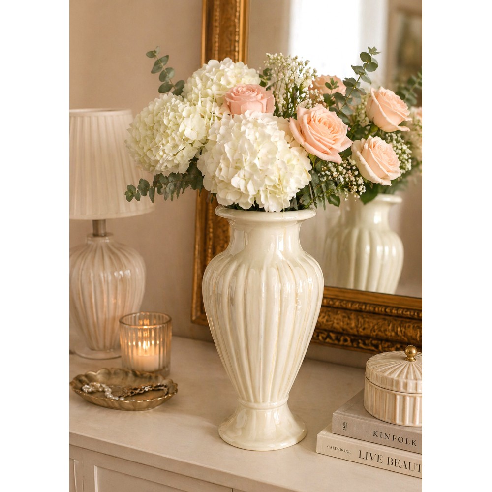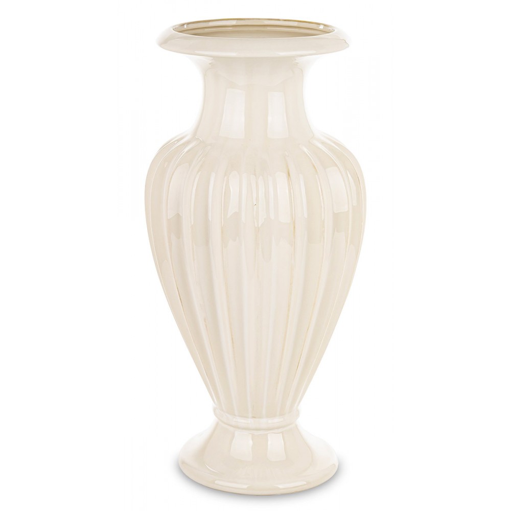 Stylowy wazon ceramiczny w jasnym, kremowym odcieniu (wpadającym w ecru), który doskonale wpisuje się w eleganckie i ponadczasowe aranżacje wnętrz. Subtelne pionowe żłobienia nadają mu wyjątkowego charakteru, a delikatny połysk pięknie odbija światło, podkreślając jego formę.