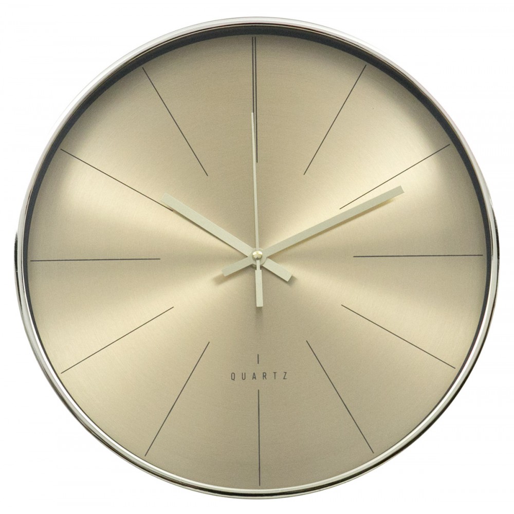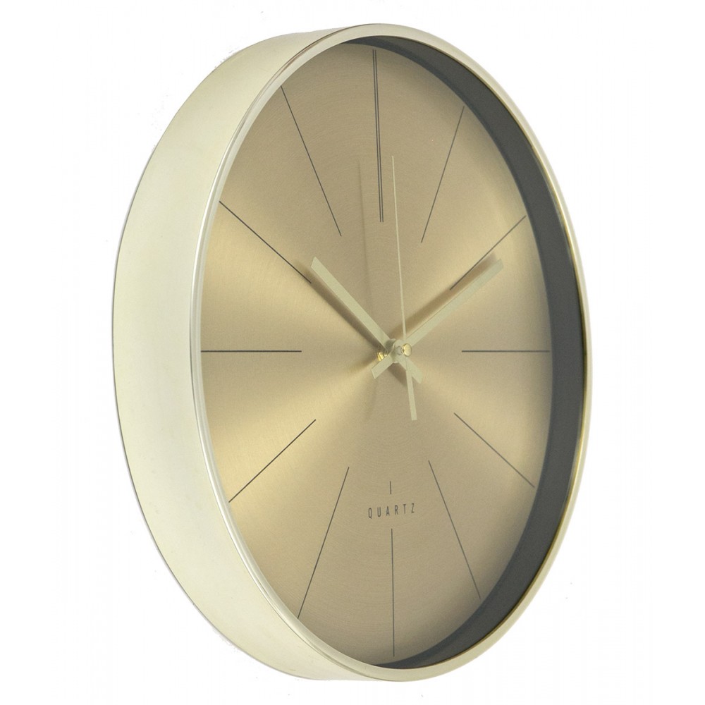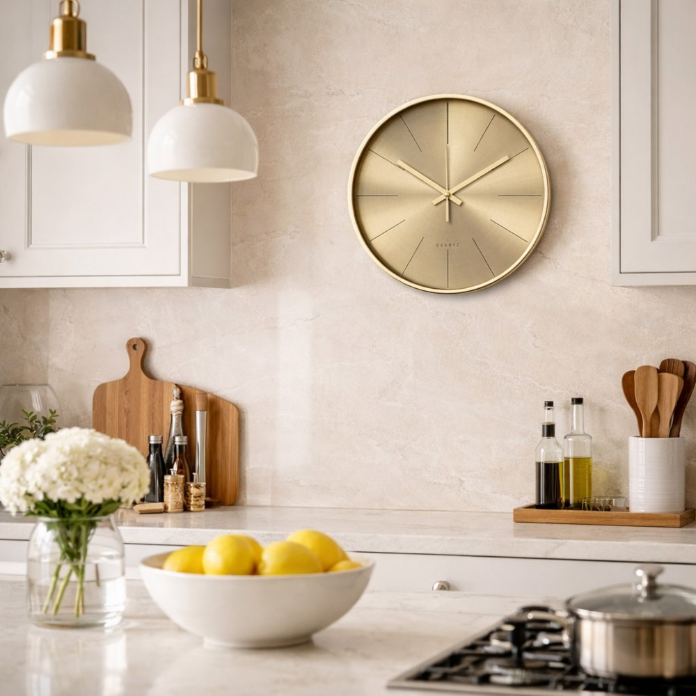 Nowoczesny zegar ścienny w eleganckim, złotym wykończeniu, który doskonale podkreśli charakter eleganckich wnętrz. Prosta, minimalistyczna tarcza bez cyfr nadaje mu wyjątkowej lekkości i sprawia, że idealnie wpisuje się w aktualne trendy aranżacyjne.