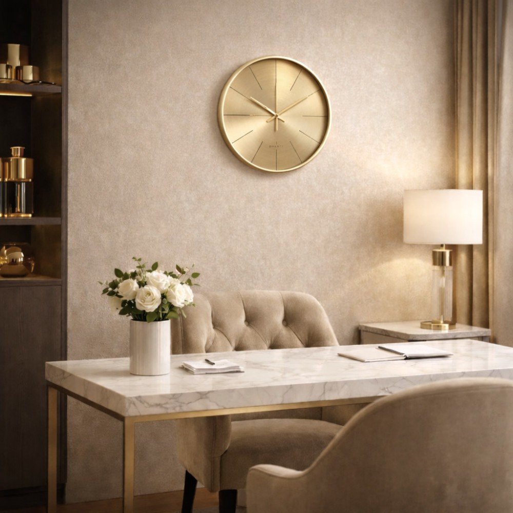 Zegar w złotym kolorze to stylowy dodatek, który wprowadzi do wnętrza nutę luksusu i nowoczesnej elegancji, jednocześnie zachowując pełną funkcjonalność.